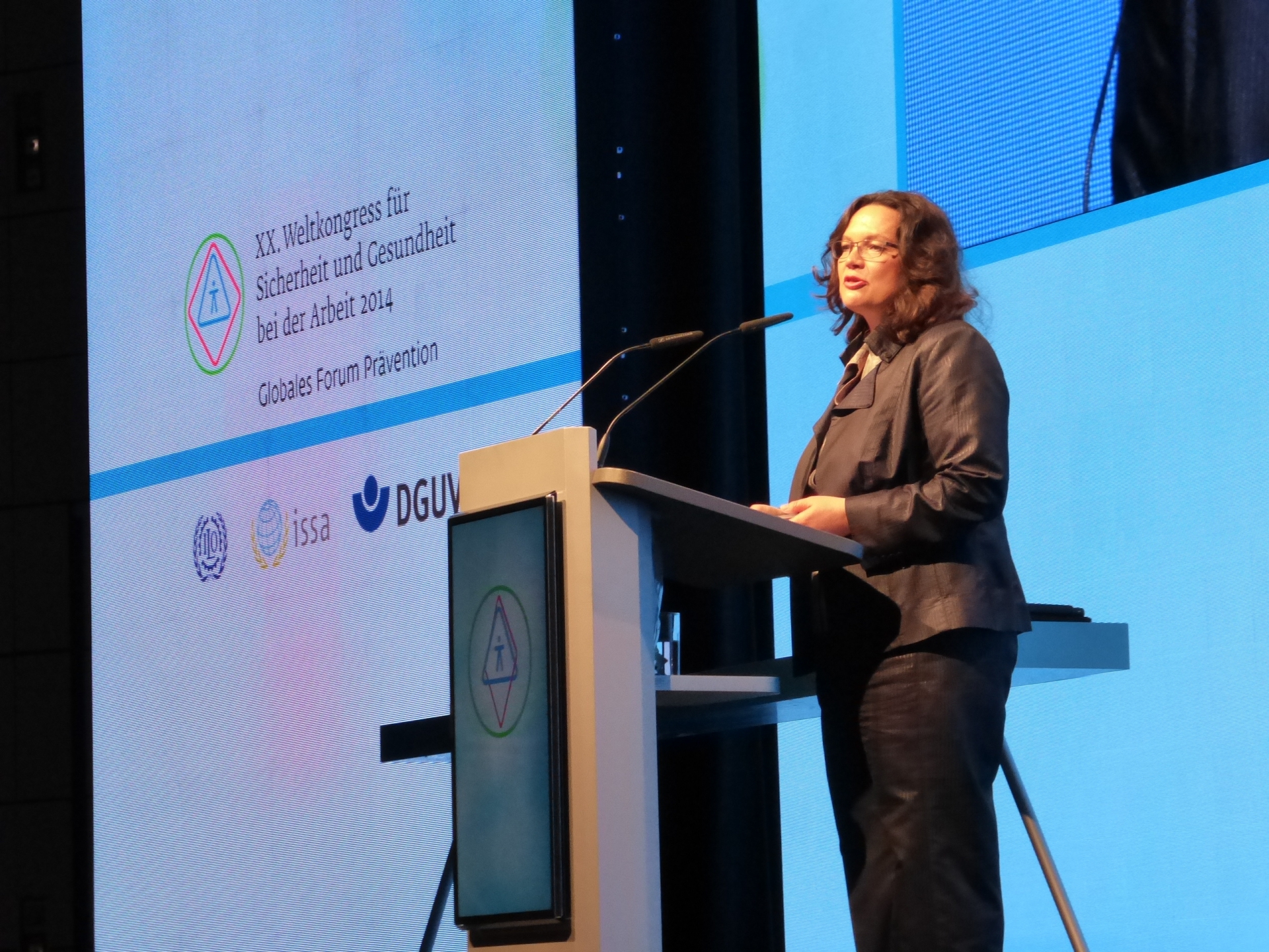 Andrea Nahles, Bundesministerin für Arbeit und Soziales, machte bei ihrer Eröffnungsrede deutlich, dass allen Verantwortlichen klar gemacht werden müsse, dass Arbeitssicherheit in Wirklichkeit Wettbewerbsvorteile bringe. „Körperliche Unversehrtheit ist jedoch nicht allein eine Frage der Rendite, sondern in erster Linie ein Menschenrecht“, sagte die Ministerin auch mit Blick auf verheerende Unglücke in Schwellenländern, in denen die reicheren Staaten produzieren lassen. Hier sieht sie auch die Unternehmen in der Pflicht: „Die Industrieländer müssen mehr für den Schutz von Arbeitnehmern weltweit tun und dürften nicht von den schlechten Arbeitsbedingungen in anderen Ländern profitieren“, forderte Andrea Nahles.