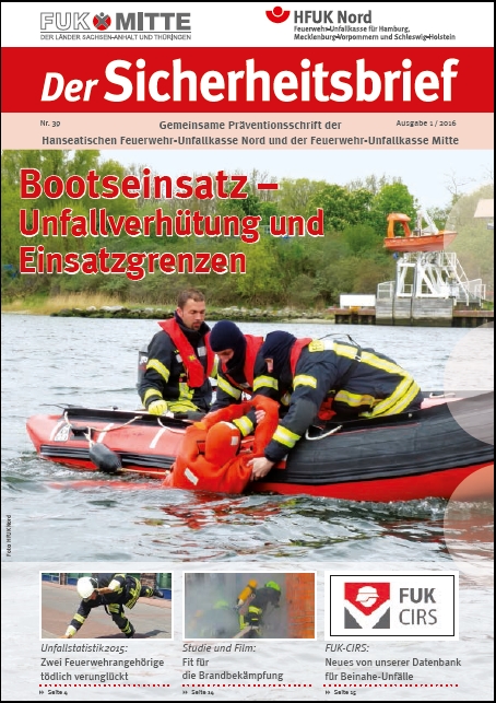 Die Hanseatische FUK Nord und die Feuerwehr-Unfallkasse Mitte haben im Rahmen der Kooperation beider Kassen ihren nächsten gemeinsamen "Sicherheitsbrief" herausgebracht. Es ist die 39. Ausgabe der Präventionsschrift für den Feuerwehrdienst. Titelthema dieser Ausgabe ist: Bootseinsatz - Unfallverhütung und Einsatzgrenzen. Weitere Themen: Zwei Feuerwehrangehörige in 2015 tödlich verunglückt, "Fit für die Brandbekämpfung" als Studie und Film, Neues von der Datenbank für Beinahe-Unfälle FUK-CIRS, ...
