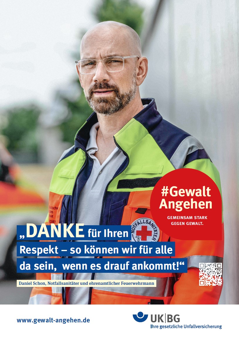 Berufsgenossenschaften, Unfallkassen und DGUV starteten die Kampagne #Gewalt-Angehen im Dezember 2023 mit dem Ziel, sich klar gegen jede Form von Gewalt gegenüber Einsatzkräften zu positionieren. Zuvor war es in der Silvesternacht 2022 in mehreren deutschen Großstädten zu massiven Gewaltausbrüchen und Angriffen auf Einsatzkräfte von Polizei, Feuerwehr und Rettungsdiensten gekommen. 2024 wurde eine branchenübergreifende Resolutionder DGUV-Mitgliederversammlung „Gewalt bei der Arbeit und im Ehrenamt begegnen wir gemeinsam“ veröffentlicht. Schirmherrin der Kampagne ist Bärbel Bas, Bundesministerin für Arbeit und Soziales. Wer bei der Arbeit von Gewalt betroffen ist, steht unter dem Schutz der gesetzlichen Unfallversicherung. Das umfasst sowohl Leistungen der Prävention als auch Rehabilitation. Die gesetzliche Unfallversicherung bietet beispielsweise das Psychotherapeutenverfahren an. Wer im Rahmen seiner beruflichen Tätigkeit ein Gewaltereignis erlebt hat, bekommt so innerhalb weniger Tagen professionelle Unterstützung.