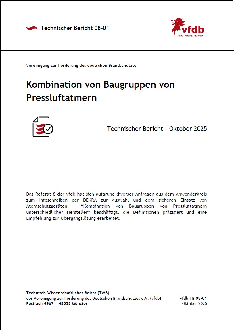Das Referat 8 der Vereinigung zur Förderung des Deutschen Brandschutzes e.V. (vfdb) hat sich aufgrund diverser Anfragen aus dem Anwenderkreis zum Infoschreiben der DEKRA zur Auswahl und dem sicheren Einsatz von Atemschutzgeräten - “Kombination von Baugruppen von Pressluftatmern unterschiedlicher Hersteller” aus dem Jahr 2024 beschäftigt und dazu einen technischen Bericht herausgebracht. Es geht dabei im Wesentlichen um die Kombinationen von Baugruppen von Pressluftatmern unterschiedlicher Hersteller.