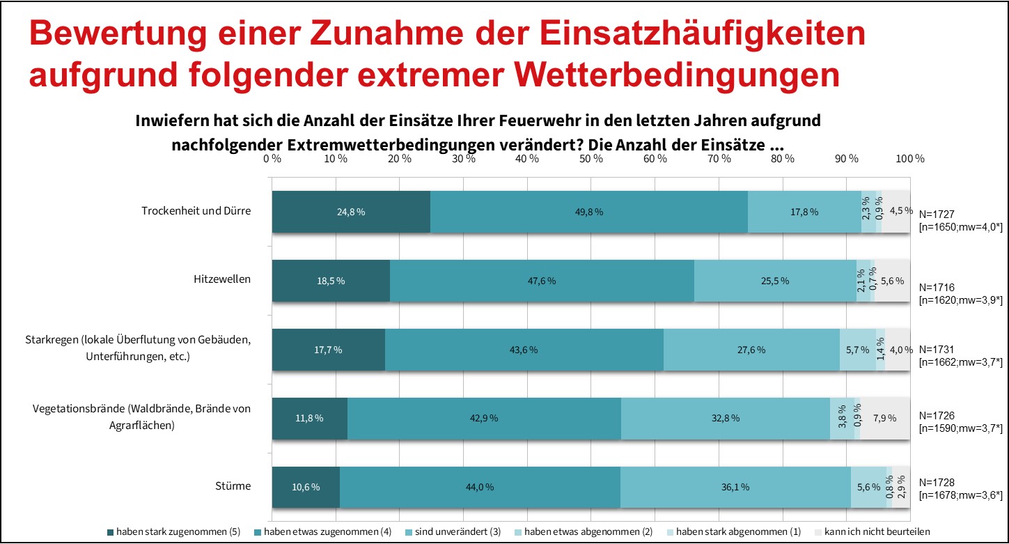 Knapp drei Viertel aller Befragten geben an, dass in diesem Zusammenhang mehr Ressourcen hinsichtlich Zeit, Maschinen und Gerätschaften sowie Personal benötigt werden. Als weitere Zunahme am Einsatzgeschehen wurden Starkregen und Stürme genannt. Vor diesem Hintergrund stehen körperliche und auch psychische Belastungen besonders im Fokus. Intensive und langanhaltende Einsätze führten die Befragten dabei als besonders kritisch auf, verbunden mit der Erwartung, dass diese in Zukunft zunehmen werden.