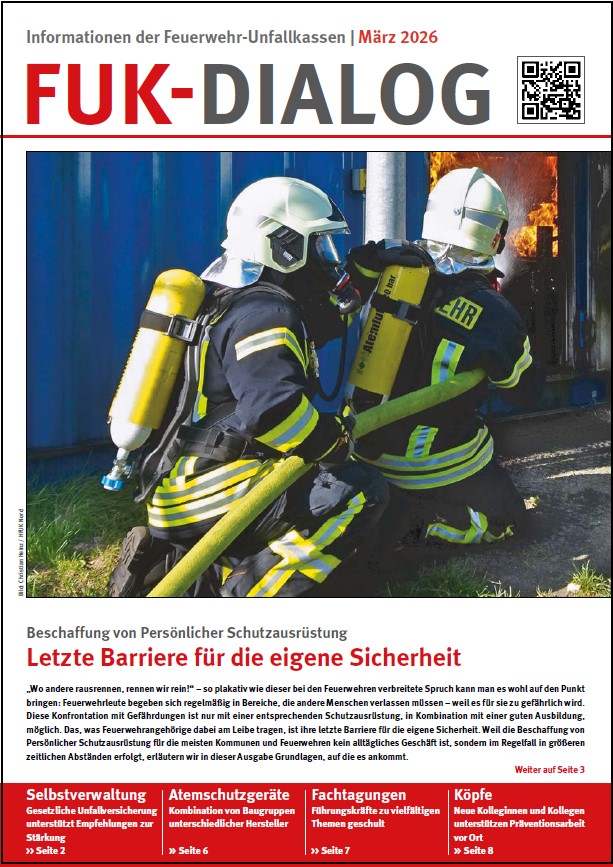 Der neue FUK-Dialog, Ausgabe März 2026, ist erschienen. Das Titelthema behandelt die Beschaffung von Persönlicher Schutzausrüstung, welche die "letzte Barriere" für die eigene Sicherheit der Einsatzkräfte darstellt. Des Weiteren geht es um Empfehlungen der DGUV zur Stärkung der Selbstverwaltung, die Kombination von Baugruppen unterschiedlicher Hersteller von Atemschutzgeräten, Führungskräfteschulungen der Feuerwehr-Unfallkassen und die Vorstellung neuer Kolleginnen und Kollegen in der Präventionsarbeit.