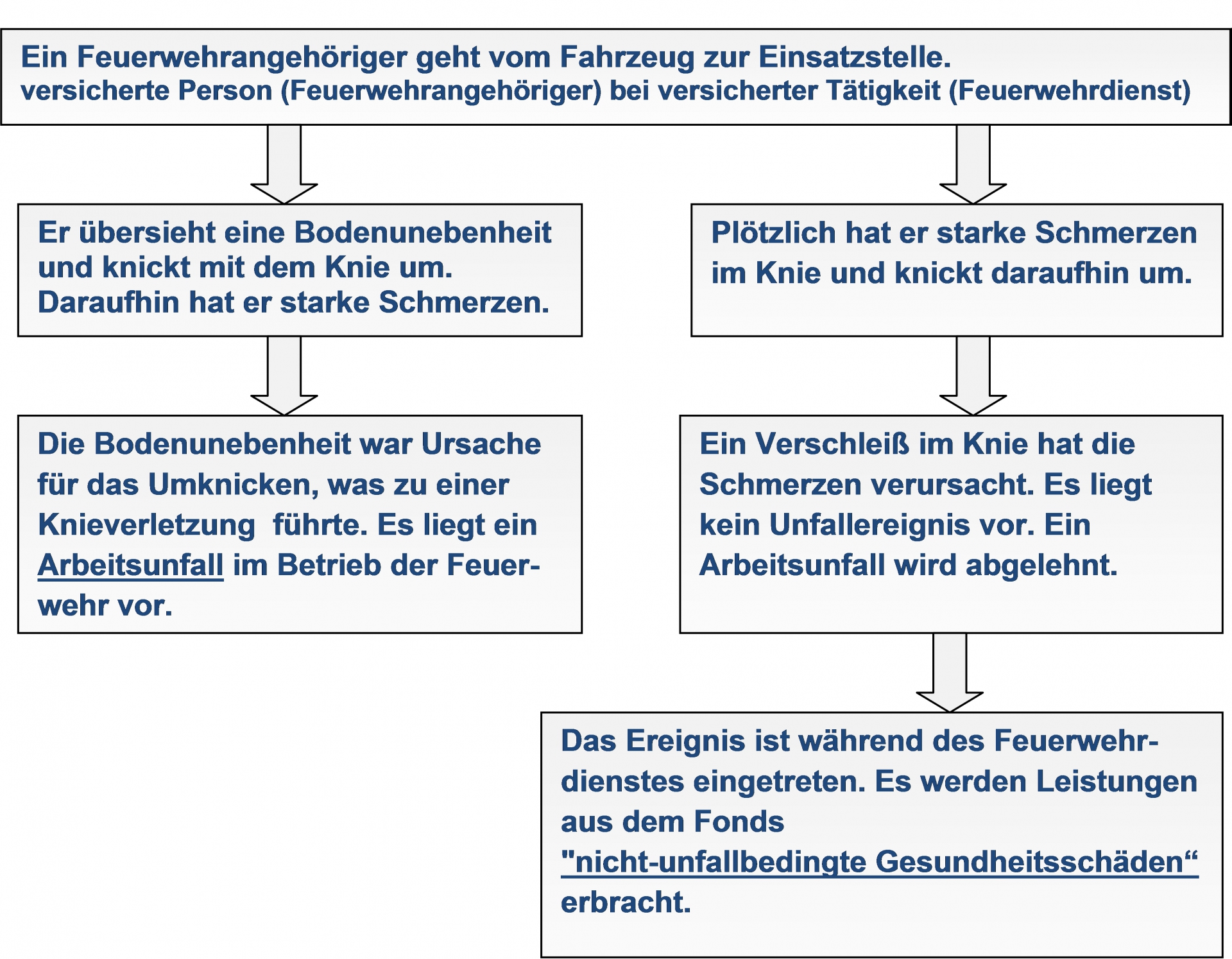 Für einen Außenstehenden ist es nicht leicht nachzuvollziehen, was in welchem Fall kein Arbeitsunfall sondern ein „nicht-unfallbedingter Gesundheitsschaden“ im Feuerwehrdienst ist. Mit einem einfachen Beispiel soll dieser Unterschied verdeutlicht werden.