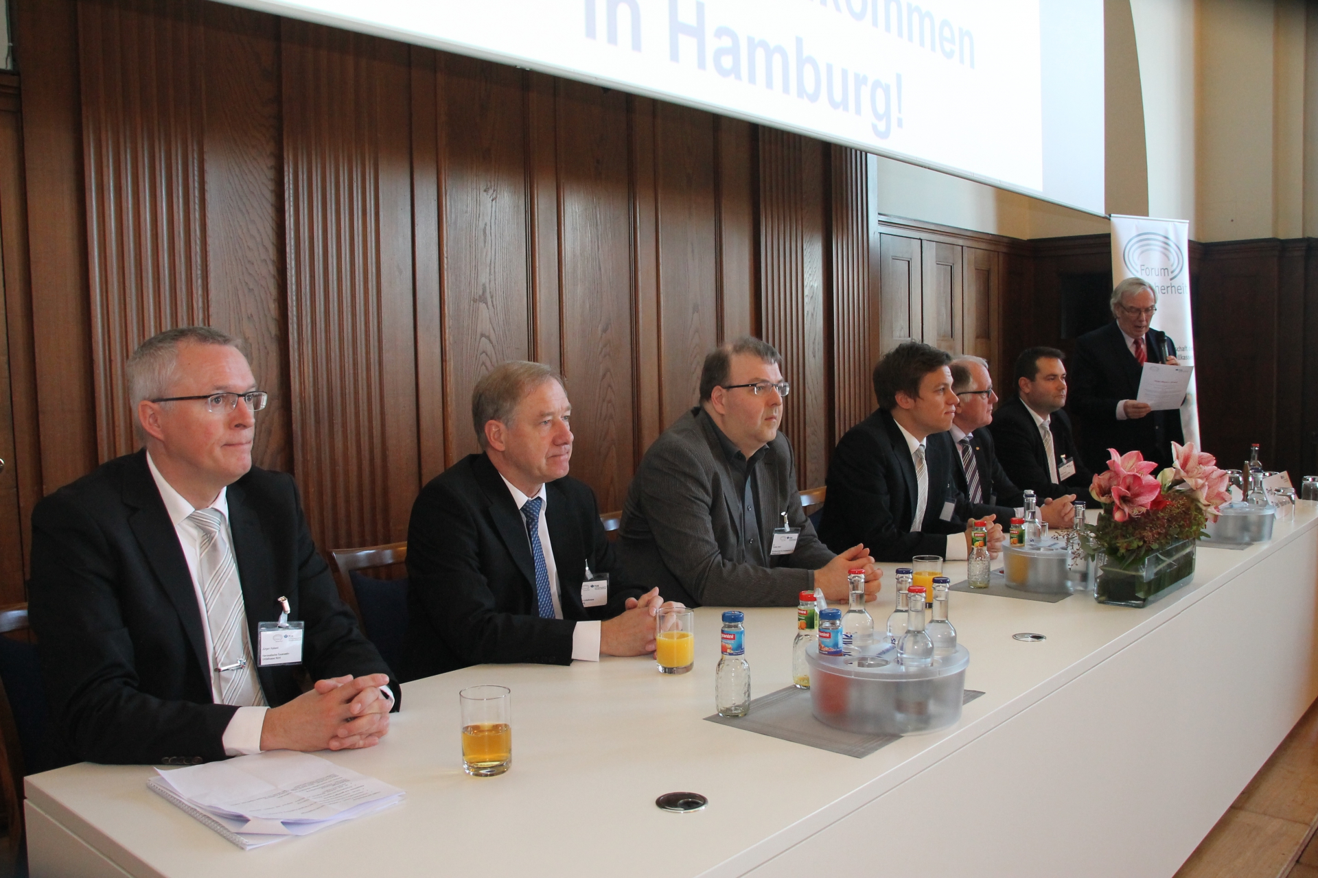 Podiumsdiskussion mit den Referenten des zweiten Tages Jürgen Kalweit (Leitende Aufsichtsperson HFUK Nord), Rolf Reich (Aufsichtsperson FUK Brandenburg), Dr. Torsten Wolf (Fachberater Freiwillige Feuerwehr Bochum), Jens-Oliver Mohr (Referent für gesundheitliche Prävention HFUK Nord), Thomas Wittschurky (Geschäftsführer FUK Niedersachsen), Christian Heinz (stellv. Geschäftsführer HFUK Nord) und dem Moderator Prof. Peer Rechenbach (v.l.n.r.)